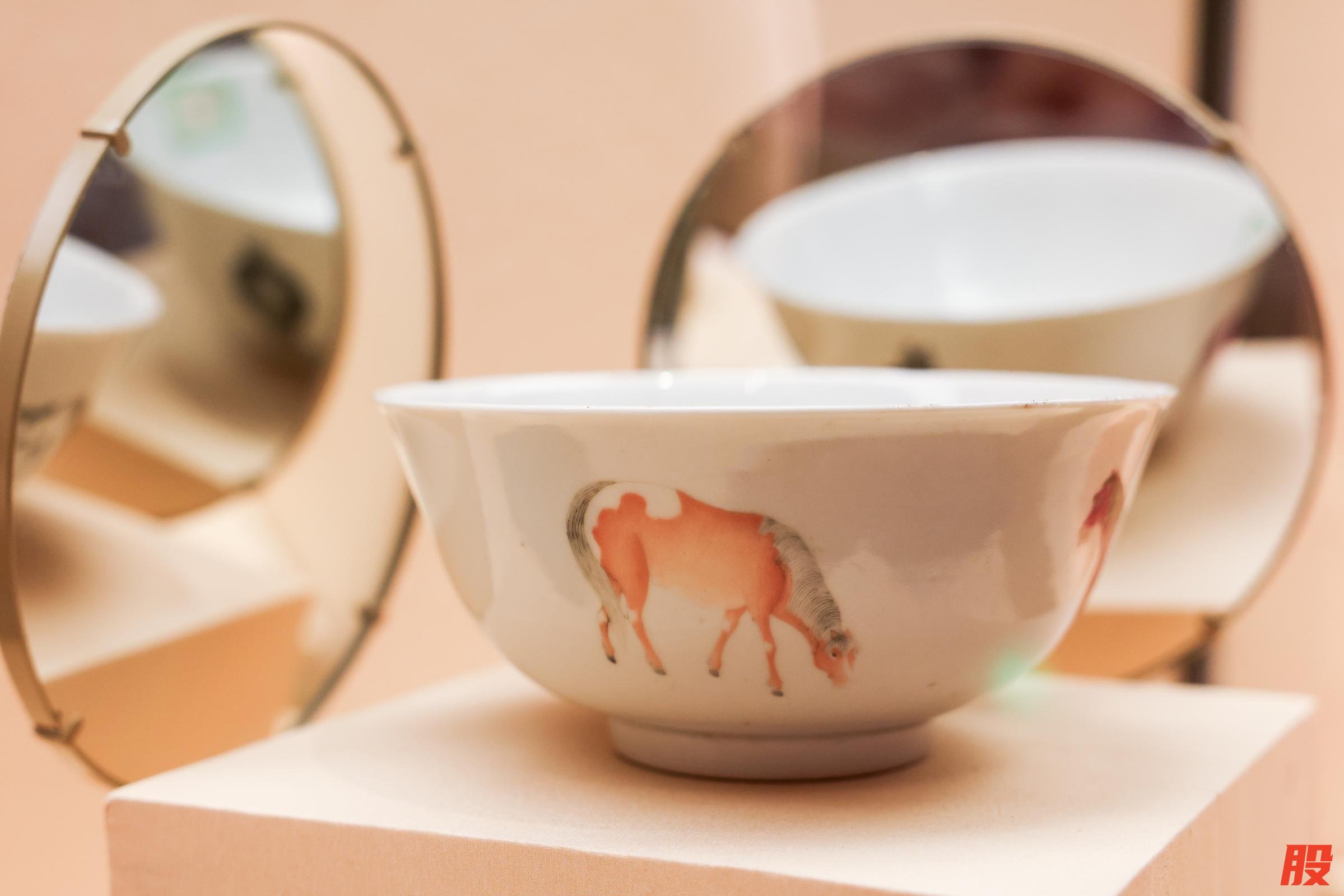一只清代道光年间的粉彩四马图碗外壁,粉彩描绘4匹皮毛色泽丰富的骏马,一只低头舔舐,一只昂首挺立,一只回首顾盼,还有一只悠然背立。